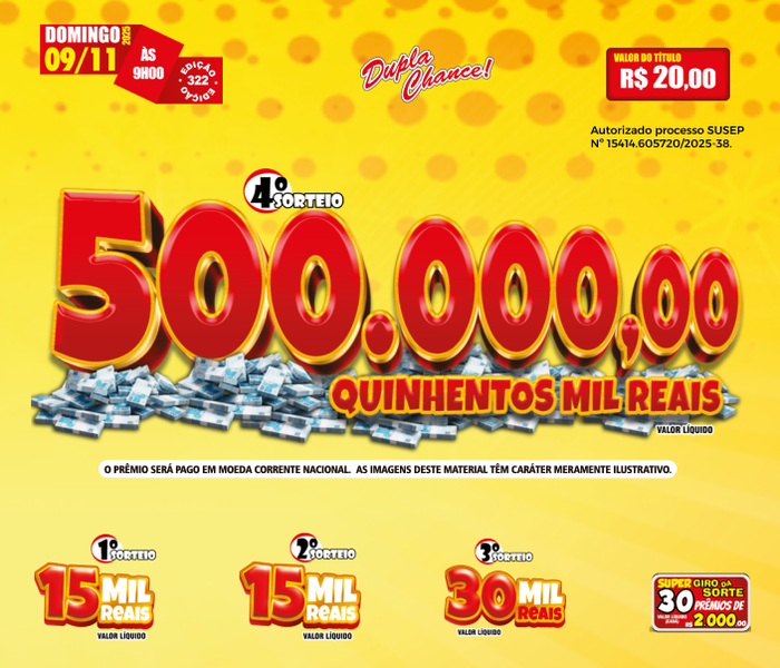 Sorteios realizado aos Domingos, às 09h00, ao vivo através da TV Band e You Tube.