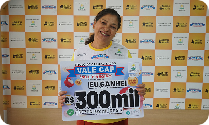 Dalva Regina dos Reis Santos, da cidade de São José dos Campos, vem sonhando em ganhar o prêmio do Vale Cap há muito tempo. Sua persistência valeu a pena porque foi a sortuda que levou sozinha 300 mil reais no quarto sorteio do dia 14 de setembro. A dona de casa, de 57 anos é casada e tem um casal de filhos.